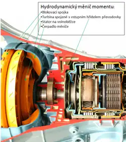 - Moderní měniče proto mají integrovanou klasickou třecí spojku, která může být v tento okamžik aktivována. Pak je přenos výkonu kapalinou vyřazen a moment se přenáší třecí spojku.