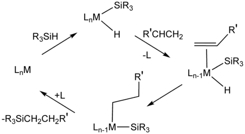 Hydrosilylační reakce probíhají převážně Chalkovým-Harrodovým mechanismem, kdy se utváří kovový komplex obsahující hydridovou skupinu, silylový ligand (R3Si) a alken, který je substrátem. Poté probíhá oxidační adice, jejímž meziproduktem je komplex silanu a přechodného kovu, v němž jsou ještě přítomny některé vazby Si-H.
