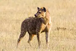Hyena skvrnitá (Crocuta crocuta) je největší druh hyeny vyskytující se v Africe, jižně od Sahary. Je zároveň nejhojnější velkou africkou šelmou, celkový počet zvířat žijících ve volné přírodě se pohybuje mezi 27 000 a 47 000 (stav k roku 2015). Jedná se o potravního oportunistu – predátora i mrchožrouta zároveň, který žije ve smečkách obvykle zvaných klany.[2] Hyeny jsou pozorné a pečlivé matky, proto známé přirovnání „hyení matka“ určené nezodpovědným lidským matkám je naprosto scestné.[3] Ačkoliv dochází k postupnému poklesu počtu jedinců, Mezinárodní svaz ochrany přírody hodnotí hyenu skvrnitou jako málo dotčený druh.[4]