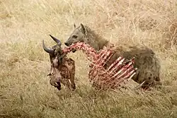 Hyeny buď aktivně loví, nebo vyhledávají mršiny. Zabíjejí především kopytníky, a to i velké druhy, jakými jsou třeba zebry. Někdy přepadnou i stádo domácích zvířat. Dokonce zraní i lva nebo jej odeženou od kořisti. (Má se za to, že při poměru počtu hyen ku lvicím 3 : 1 jsou síly v rovnováze, při vyšším počtu hyen lvice zpravidla ustupují.) Samotná hyena dokáže od kořisti odehnat levharta, pravidelně krade kořist gepardům a zejména psům hyenovým, ti jsou sice rychlejší, ale mají až třikrát nižší hmotnost. Pokud má hyena možnost, zabíjí konkurenčním predátorům mláďata. Výjimečně si troufne i na lov sloních mláďat.