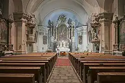 Interiér kostela sv. Mikuláše v Hynčicích u Města Albrechtic - Bývalá fara (čp. 4) s areálem zahrady a bývalého farního dvora - současná stavba s prvky lidového stavitelství v podobě z 30. let 18. století vznikla přestavbou staršího objektu.[1]
