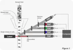 K excitaci se využívá svazek jednoho anebo více laserů. Biologické částice jsou seřazeny jedna po druhé v kapiláře pomocí proudu vody. Procházejí postupně paprskem laseru při excitačním času okolo 1–10 µs.[2] Emitované spektrum se pohybuje v rozmezí 350–800 nm.[3] Emitované světlo a světlo odražené je rozděleno soustavou dichroických zrcadel a band-pass filtrů (pásmová propust).[4] Problémem může být, že část světla bývá na těchto filtrech a zrcadlech pohlcena. Tento problém se řeší vhodným nastavením úhlů těchto zrcadel filtrů.[2] Nejprve bývají odkloněny části spektra o větší vlnové délce, kvůli daleko větší energii. K vedení jednotlivých paprsků se využívá optických kabelů. Výsledné vyfiltrované paprsky jsou sbírány fotonásobiči a následně ukládány k další analýze. Pro Forward Scatter a SideScatter se užívá fotodiod a pro fluorescenční emisi fotonásobičů.
