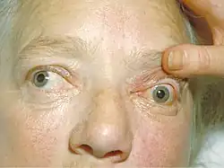 Problémy s očima jsou další příznak hypertyreózy. Často dochází k pálení a řezání v oku, bolest na zadní straně oka, nadměrné vystupování očních bulbů z očnic,[5] kvůli kterému dochází k vysychání rohovky. Dále se objevuje nadměrné slzení a pálení očí. V krajních případech může dojít k chabnutí očních svalů.[2]