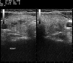 Při dalších vyšetřeních pacient podstupuje sonografii štítné žlázy,[7] při kterém se zjišťují uzly a útvary ve štítné žláze mimo normu. Tyto útvary musí být včas podchyceny a pravidelně kontrolovány lékařem, aby nedošlo k rakovině štítné žlázy.