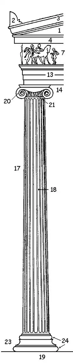 1 – tympanon, 2 – akrotérion, 3 – sima, 4 – římsa, 7 – vlys, 13 – třikrát odstupněný architráv, 14 – hlavice, 17 – dřík, 18 – kanelování, 19 – stylobat, 20 – voluta, 21 – echinus zdobený vejcovcem, 23 – patka, 24 – torus