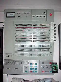 Operátorská konzole System/360 Model 65 s kontrolkami indikujícími hodnoty v registrech a přepínači (uprostřed obrázku) a s hlavním vypínačem „Big Red Switch" vpravo nahoře.