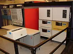 Procesorová jednotka IBM System/360 Model 30 (červená skříň uprostřed obrázku), magnetopáskové jednotky vlevo a diskové jednotky vpravo, v Computer History Museum