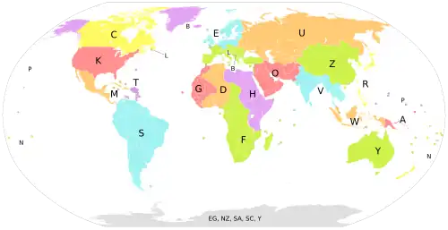 První dvě písmena kódu označují stát podle následující tabulky. (Některé velké státy mají přiděleno více označení.)