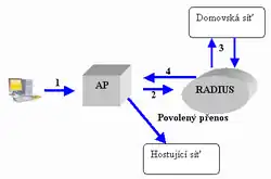 - pokud uživatel lokální není, proběhne žádost o autentizaci přes strukturu RADIUS serverů až k uživatelově domovské síti
