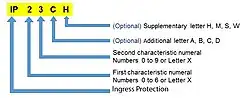 | IP x6 | Chráněno proti intenzivně tryskající vodě. Voda míří 12,5 mm tryskou ve všech úhlech při průtoku 100 litrů za minutu při tlaku 100 kN/m² po dobu nejméně 3 minuty ze vzdálenosti 3 metry. |