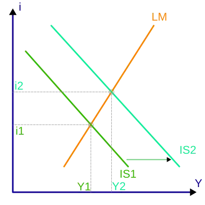V modelu se dají zobrazovat účinky fiskální politiky. Pokud se zvýší deficit rozpočtu (fiskální expanze – státní výdaje rostou), má to stejné účinky jako např. zvýšení soukromých investic, tedy že se zvyšuje poptávka po domácím produktu na každé úrovni úrokové míry. Pokud dojde k fiskální expanzi, posouváme křivku IS doprava. To samozřejmě zvýší rovnovážný bod – zvýší se úroková míra (z bodu i1 do bodu i2) i HDP (z Y1 do Y2).