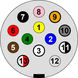 Norma popisuje zapojení 13. pólové zásuvky automobilů pro připojení elektrické soustavy přípojných vozidel.
