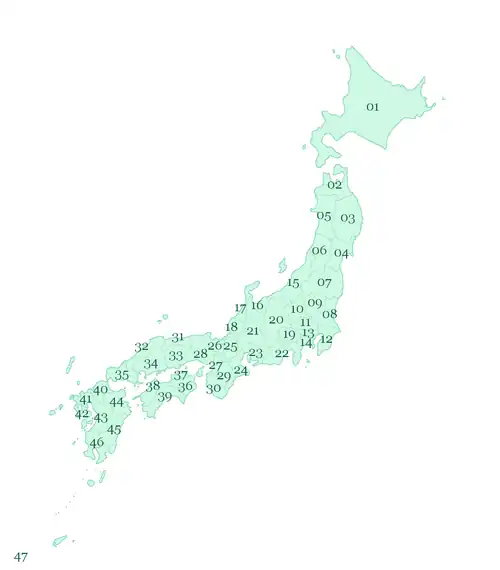 Kódy ISO 3166-2 pro Japonsko identifikují 47 prefektur (stav v roce 2015). První část (JP) je mezinárodní kód pro Japonsko, druhá část sestává ze dvou čísel identifikujících prefekturu.