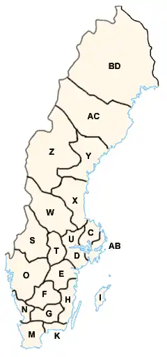 SE-AB Stockholm (Stockholm) SE-AC Västerbotten (Umeå) SE-BD Norrbotten (Luleå) SE-C Uppsala (Uppsala) SE-D Södermanland (Nyköping) SE-E Östergötland (Linköping) SE-F Jönköping (Jönköping) SE-G Kronoberg (Växjö) SE-H Kalmar (Kalmar) SE-I Gotland (Visby) SE-K Blekinge (Karlskrona) SE-M Skåne (Malmö) SE-N Halland (Halmstad) SE-O Västra Götaland (Göteborg) SE-S Värmland (Karlstad) SE-T Örebro (Örebro) SE-U Västmanland (Västerås) SE-W Dalarna (Falun) SE-X Gävleborg (Gävle) SE-Y Västernorrland (Härnösand) SE-Z Jämtland (Östersund)