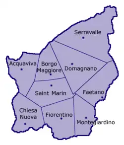SM-01 Acquaviva SM-06 Borgo Maggiore SM-02 Chiesanuova SM-03 Domagnano SM-04 Faetano SM-05 Fiorentino SM-08 Montegiardino SM-07 San Marino SM-09 Serravalle