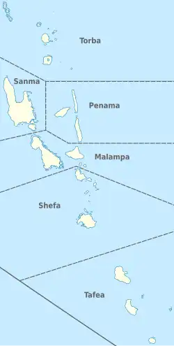 VU-MAP Malampa (Lakatoro) VU-PAM Pénama (Longana) VU-SAM Sanma (Luganville) VU-SEE Shéfa (Port Vila) VU-TAE Taféa (Isangel) VU-TOB Torba (Sola)