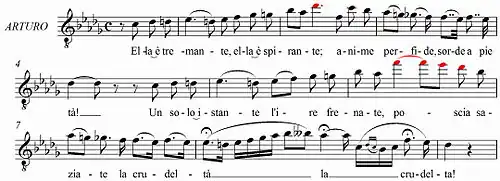 Hranice mezi árií a sborem se často stírá, jako ve slavné Arturově vstupní árii A te, o cara, kde se Elvira, další sólisté a sbor účastní refrénu; celá scéna obsahuje efektní hudební vyvrcholení a je plná téměř zdrcující krásy a oduševnělého romantického patosu – Rosselli mluví o „záblesku nebe“ (glimpse of heaven).[27] Bellini napsal roli Artura speciálně pro svého oblíbeného zpěváka, slavného Giovanni Battista Rubiniho, typicky romantického vysokého tenora, který – na rozdíl od mnoha moderních tenorů ovlivněných verismem – zpíval vysoké a nejvyšší tóny lyricky, piano a dokonce i pianissimo ve falzetu nebo nanejvýše s voix mixte (hlasová technika smíšený hlas, při které se mísí hrudní hlas s falzetem) přičemž byly možné i extrémní tóny, jako je vysoké des'' a f'' v Credeasi, misera! da me tradita ve finále 3. dějství. (Vysoké f'' se někdy vynechává nebo je sníženo, v závislosti na zpěvákovi a situaci, což je legitimní s ohledem na historickou interpretační praxi, kdy se varianty nebo ozdoby zpívaly v opakováních tak jako tak).