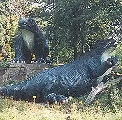 Richard Owen spolu se sochařem a přírodovědcem Waterhousem Hawkinsem postavili téměř dva tucty soch různých prehistorických zvířat v životní velikosti. Sochy byly vytvořeny z betonu, který pokrýval ocelové a cihlové jádro. Mezi nimi byli i dva iguanodoni v Crystal Palace v Londýně, z nichž jeden stál a druhý odpočíval na břiše. Před dokončením sochy stojícího dinosaura jeho tvůrci uvnitř uspořádali banket pro dvacet lidí.[33][34][35] Krátce před svou smrtí roku 1852 si Mantell uvědomil, že Iguanodon nebylo těžké tlustokožcům podobné zvíře,[36] jak se domníval Owen, ale jeho stav mu už nedovolil se na stavbě londýnských soch dinosaurů podílet, a tak Owenova vize ovlivnila vnímání dinosaurů u veřejnosti na celá další desetiletí.[31]