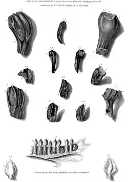 - ↑ a b c MANTELL, Gideon A. Notice on the Iguanodon, a newly discovered fossil reptile, from the sandstone of Tilgate forest, in Sussex. Philosophical Transactions of the Royal Society. 1825, roč. 115, s. 179–186. Dostupné online. doi:10.1098/rstl.1825.0010. (anglicky)