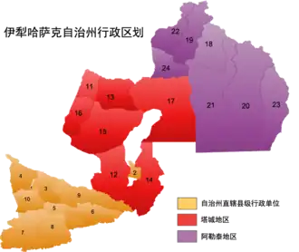 ![]() Autonomní kraj Ili: přímo spravované celky okresní úrovně prefektura Tcha-čcheng prefektura Altaj