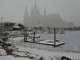 Svatovítská katedrála jako přelud nad zamrzlým zálivem v Brooklynu (Dvojexpozice)