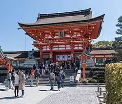 Vstup do svatyně Inari je většinou označen jednou či více červenými branami torii a sochami kicune, které často věřící z úcty zdobí červenými bryndáčky yodarekake. Samotná červená barva začala být spojována s Inari, kvůli její převaze ve svatyních Inari a na branách torii.[23] Za hlavní svatyni je považována svatyně Fušimi Inari ve Fušimi v Kjótu, kde je celá cesta k samotné svatyni značená branami torii. Sochy kicune jsou občas považovány za vtělení Inari a typicky se objevují v páru, symbolizující muže a ženu.[24] Tyto sochy lišek drží symbolický předmět v tlamě nebo pod přední tlapou — nejčastěji šperk a klíč, ale snop rýže, svitek a liščí mládě jsou také běžné. V naprosté většině byť sebemenších svatyní Inari naleznete alespoň jeden pár těchto soch, nejčastěji po stranách, na oltáři nebo před hlavní svatyní.[24] Bývají spíše stylizované než realistické a zobrazují lišku usazenou, s ocasem ve vzduchu a hledící vpřed. Přesto se každá socha něčím liší a stěží najdete dvě stejné.[25][26]