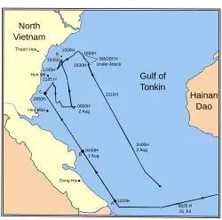 2. srpna Maddox hlásil, že byl napaden třemi severovietnamskými torpédovými čluny třídy P-4 ve vzdálenosti 28 mil (45 km) od pobřeží v mezinárodních vodách.[10] Maddox hlásil, že se musel vyhnout útoku torpéda a zahájit palbu svými 127milimetrovými kanóny, aby zatlačil hlídkující čluny na ústup. Americké námořnictvo reagovalo leteckým útokem čtyř letounů F-8 Crusader z letadlové lodi USS Ticonderoga (CV-14) na ustupující čluny, přičemž hlásilo, že jeden severovietnamský člun potopilo a druhý těžce poškodilo. Maddox utrpěl jen velmi malé poškození zásahem 14,5 mm projektilu a vrátil se do jihovietnamských vod, kde se připojil k torpédoborci USS Turner Joy (DD-951). Severovietnamci zase hlásili, že zasáhli Maddox jedním torpédem a jedno americké letadlo sestřelili.