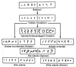 Indicko-arabské číslice byly vynalezeny matematiky v Indii. Persko-arabští matematici je nazývali „číslice Hindů“ (kde „Hind“ bylo označení pro Indy). Později se jim v Evropě začalo říkat „arabské číslice“, protože na Západě byly představeny arabskými obchodníky.[3]