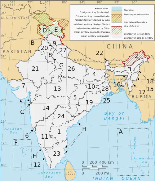 Indie,[pozn. 2] plným názvem Indická republika,[pozn. 3] je stát v jižní Asii, nejlidnatější země světa.[6][7] Na jihu ji ohraničuje Indický oceán, na jihozápadě Arabské moře a na jihovýchodě Bengálský záliv, na západě sousedí s Pákistánem,[pozn. 4] na severu s Čínou, Nepálem a Bhútánem a na východě s Bangladéšem a Myanmarem. V Indickém oceánu se poblíž Indie nachází Srí Lanka a Maledivy; její Andamanské a Nikobarské ostrovy mají námořní hranici s Thajskem, Myanmarem a Indonésií. Na úplném severu země leží nejvyšší hory, severní, střední a východní část tvoří úrodná nížina, jižní indický poloostrov se rozkládá na náhorní plošině. Podnebí v Indii se pohybuje od rovníkového na jihu až po vysokohorské a tundrové v nejvyšších oblastech Himálaje. Indie se dělí na 28 států a 8 teritorií, na ploše 3,3 milionu km2 žije 1,4 miliardy obyvatel.[2] Je tak sedmou největší zemí podle rozlohy a od získání nezávislosti v roce 1947 nejlidnatější demokracií na světě.[9] Hlavním městem je Nové Dillí, největším městem je Bombaj, mezi další velká města patří Dillí, Bengalúru a Hajdarábád. Jedná se o etnicky a jazykově rozmanitou zemi, úředními jazyky jsou hindština a angličtina. Čtyři pětiny obyvatel se hlásí k hinduismu, 14 % k islámu a 2 % ke křesťanství.