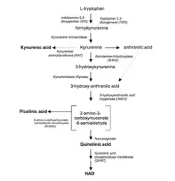 - ↑ BADAWY, Abdulla A.-B.; BANO, Samina. Tryptophan Metabolism in Rat Liver after Administration of Tryptophan, Kynurenine Metabolites, and Kynureninase Inhibitors. International Journal of Tryptophan Research. 2016-01, roč. 9, s. IJTR.S38190. Dostupné online [cit. 2019-02-14]. ISSN 1178-6469. doi:10.4137/ijtr.s38190.