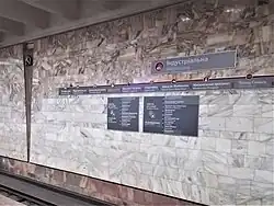 Stanice je trojlodní, kdy obklad pilířů a kolejové zdi je z mramoru.