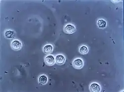 bílé krvinky v moči člověka s infekcí močových cest (mikroskopováno) | |