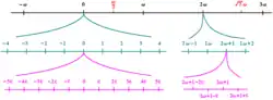 Nekonečně malé (ε) a nekonečné (ω) na hyperreálné číselné ose ve třech různých měřítcích, každé zvětšené nekonečně. Platí 1/ε = ω/1. Na prvním řádku nelze rozeznat konečná čísla, protože jsou všechna nedozírně blízko k nule. Ve druhém řádku jsou nekonečně malá, téměř nulová a ve třetím řádku jsou nekonečná, téměř nedozírná. Licence: CC BY-SA 3.0