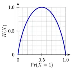 Entropie Η(X) (tj. střední překvapení) vrhu mincí měřené v bitech vynesené podle poctivosti mince Pr(X = 1), kde X = 1 reprezentuje padnutí panny.