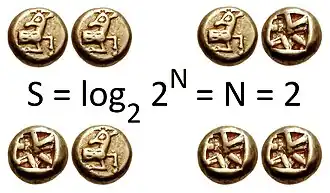 Dva bity entropie: Při dvou hodech poctivou mincí je informační entropie vyjádřená v bitech logaritmus o základu 2 počtu možných výsledků; při hodu dvěma mincemi existují čtyři možné výsledky, což odpovídá dvěma bitům entropie. Informační entropie je obecně průměrné množství informace obsažené v události, pokud uvažujeme všechny možné výsledky.