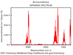 Ukázka grafu absorpce infračerveného záření brometanem (CH3Br)