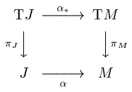 Totéž lze formulovat ještě abstraktněji v pojmech indukovaných zobrazení. Všimněme si, že totální tečný fibrovaný prostor TJ k J je triviální fibrovaný prostor J × R a že existuje kanonický řez ι v tomto prostoru takový, že ι(t) = 1 (nebo přesněji (t, 1) ∈ ι) pro všechny t ∈ J. Křivka α zavádí zobrazení fibrovaných prostorů (bundle map) α∗ : TJ → TM tak, že následující diagram komutuje: