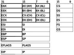 - Šest 16bitových segmentových reg. (cs,ds,es,ss,fs,gs)