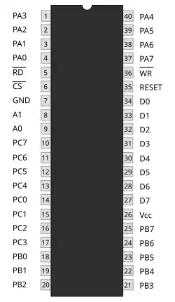 Existuje zapojení obvodu 8255, které používá porty 33, 35, 37 a 39 (šestnáctkově 21, 23, 25, 27).[11]