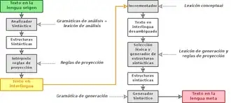 Interlingvální překladové systémy obsahují dvě monolingvální komponenty: analýzu zdrojového jazyka a interlingvy a generování interlingvy a cílového jazyka. Je nicméně nutné rozlišit mezi interlingválními systémy využívajícími pouze syntaktické metody (např. systémy vyvinuté v 70. letech na univerzitách v Grenoblu a Texasu) a těmi, které jsou založeny na umělé inteligenci (od roku 1987 v Japonsku a systémy z výzkumu na univerzitách South California a Carnegie Mellon). První typ odpovídá schématu na Obrázku 1, zatímco druhý je možné popsat diagramem na Obrázku 4.