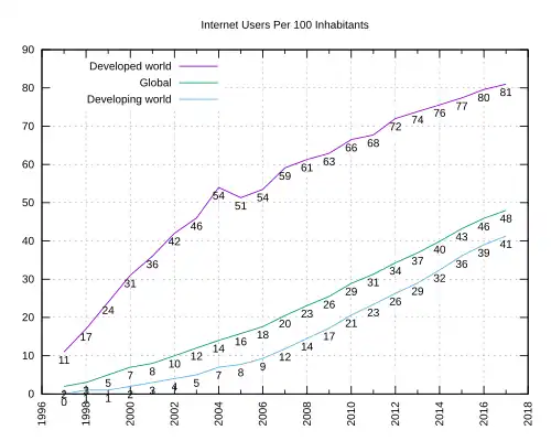 Používání internetu se rozšířilo koncem 20. století. V následující dekádě se rozvinuly služby aktivněji zapojující uživatele internetu jako byl web 2.0 nebo sociální sítě a přístup k internetu se postupně stal dostupný pro výrazný zlomek světové populace. Pro druhou dekádu byl charakteristický prudký nárůst přístupu pomocí chytrých telefonů a mobilní datové sítě a počet uživatelů dosáhl poloviny světové populace.