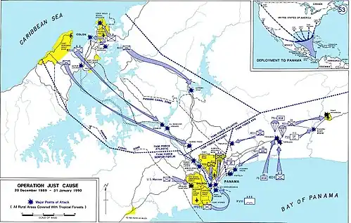 Invaze Spojených států amerických do Panamy s krycím názvem Operace Just Cause byla zahájena v prosinci 1989. K invazi došlo během úřadu amerického prezidenta George H. W. Bushe a deset let po smlouvě Torrijos – Carter, při které byla přijata změna statutu kontroly nad Panamským kanálem z výsostného území USA na neutrální území pod panamskou správou a s USA jako garantem jeho vnější obrany, s platností od roku 2000.[1] Během invaze byl panamský diktátor Manuel Noriega sesazen, zvolený prezident Guillermo Endara složil prezidentskou přísahu a Panamská obranná síla (Panamanian Defense Force - PDF) byla rozpuštěna.
