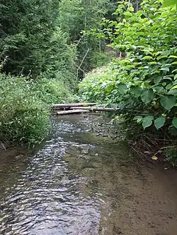 Invazní druhy v České republice – křídlatka (na pravém břehu potoka), vzadu netýkavka žláznatá