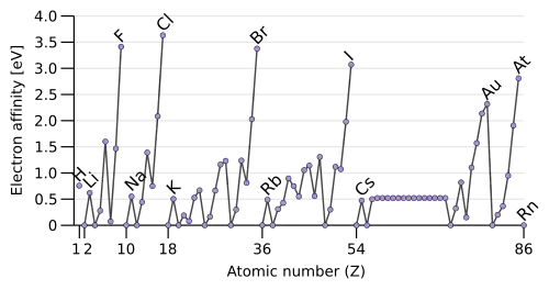 Závislost elektronové afinity na atomovém čísle. Halogeny ji mají vysokou, neboť přijetím elektronu získají konfiguraci nejbližšího vzácného plynu. Alkalické kovy ji mají nízkou, neboť k získání konfigurace nejbližšího vzácného plynu je pro ně výhodnější elektron odevzdat.