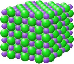 Krystalová mřížka kuchyňské soli (chlorid sodný NaCl): fialové koule jsou kationty Na+, zelené koule jsou chloridové anionty Cl−.Elektrostatická přitažlivost mezi anionty a kationty vede k vytvoření pevné látky s krystalovou mřížkou, ve které jsou ionty střídavě naskládány na sebe. V takové mřížce obvykle není možné rozlišit diskrétní molekulární jednotky, takže vytvořené sloučeniny nejsou molekulární.