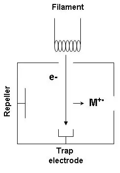 Když elektron zasáhne atom nebo molekulu, existuje šance, že během nárazu bude z částice odstraněn jeden nebo více elektronů. Atom nebo molekula je pak přeměněna na ion. Iontové zdroje využívající ionizaci nárazem elektronů fungují v praxi tím, že dodávají elektrony (obvykle z katody) urychlené na energii dostatečnou k vyvolání ionizace materiálu v komoře. Vytvořené ionty jsou pak extrahovány externím polem.