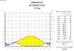 Isfahán se nachází v úrodné nížině kolem řeky Zájande rúd na úpatí pohoří Zagros. Panuje zde mírné podnebí s pravidelnými ročními obdobími. Ve vzdálenosti 90 km na sever od města neexistuje žádná překážka, která by tvořila hráz před chladnými severními větry. Samotné město leží na nejdůležitější dopravní křižovatce celého Íránu. Nachází se v nadmořské výšce 1574 m n. m. Průměrný roční úhrn srážek činí 355 mm, což je podobné jako např. u Denveru v Coloradu v USA. Roční teplota se obvykle pohybuje v rozmezí od 2 do 28 °C. Nejvyšší naměřená teplota činila 42 °C, nejnižší pak −19 °C.