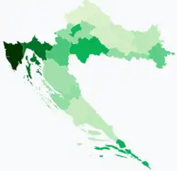 Pula (3 275), Labin (1 243), Vodnjan (858), Poreč (710), Umag (669), Raša (569), Rovinj (507), Buzet (240), Kršan (235), Sveta Nedelja (223), Buje (207), Medulin (203), Fažana (147), Ližnjan (138), Marčana (97), Novigrad, Pazin (81), Vrsar (80), Funtana (53), Brtonigla (50), Bale (41), Svetvinčenat, Žminj (36), Kanfanar (34), Tar-Vabriga (30), Višnjan (23), Sveti Lovreč (19), Pićan (13), Motovun (10), Kaštelir-Labinci (8), Grožnjan, Tinjan (7), Barban, Vižinada (6), Gračišće, Lupoglav (5), Karojba, Sveti Petar u Šumi (4), Cerovlje (3), Lanišće, Oprtalj (1)