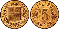 Po vyhlášení republiky v roce 1944 byl přestaven nový vzor mincí, který už nenesl dánský znak. V roce 1946 byly vyraženy mince podle projektu Stefána Jónssona a Tryggviho Magnússona, kteří zároveň zachovali rozměr předválečných mincí. Na aversu byl umístěn nový státní znak. Ozdobný charakter plnily na reversu mince větvičky (nejspíše břízy pýřité, jediného druhu stromu rostoucího na ostrově). V nové emisi chyběla mince o hodnotě 2 aurar.