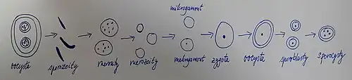 Infekce začíná pozřením oocysty hostitelem, v oocystě jsou infekční stadia kokcidie-sporozoity. Následně dochází k excystaci, během které se sporozoity uvolňují ve střevě hostitele. Tyto sporozoity pronikají do buněk střevní sliznice a začínají se množit. Uvnitř hostitelské buňky se sporozoity transformují na meronty, to jsou velká a mnohojaderná stádia. Meronty se dále množí nepohlavně merogonií, vznikají merozoity, které napadají další buňky ve střevní sliznici. V poslední generaci nepohlavního rozmnožování se vyvíjejí gamonty, které jsou pohlavně rozlišené na makrogamonty a mikrogamonty. Makrogamonty se diferencují na oocyty, zatímco mikrogamonty produkují mikrogamety. Po oplození vznikají zygoty, které si vytvářejí obal (oocystu) a během sporulace se dělí na sporoblasty. Tyto sporoblasty se následně mitoticky dělí a vytvářejí sporocysty, z nichž každá obsahuje 2-8 sporozoitů, schopných infikovat dalšího hostitele. Oocysty se uvolňují z hostitele do vnějšího prostředí trusem a zrají po sporulaci, na to má vliv vlhkost a teplota.[4][5]